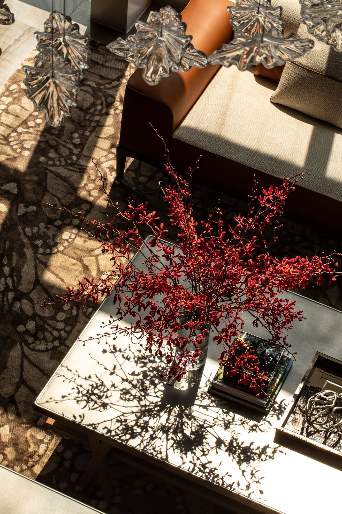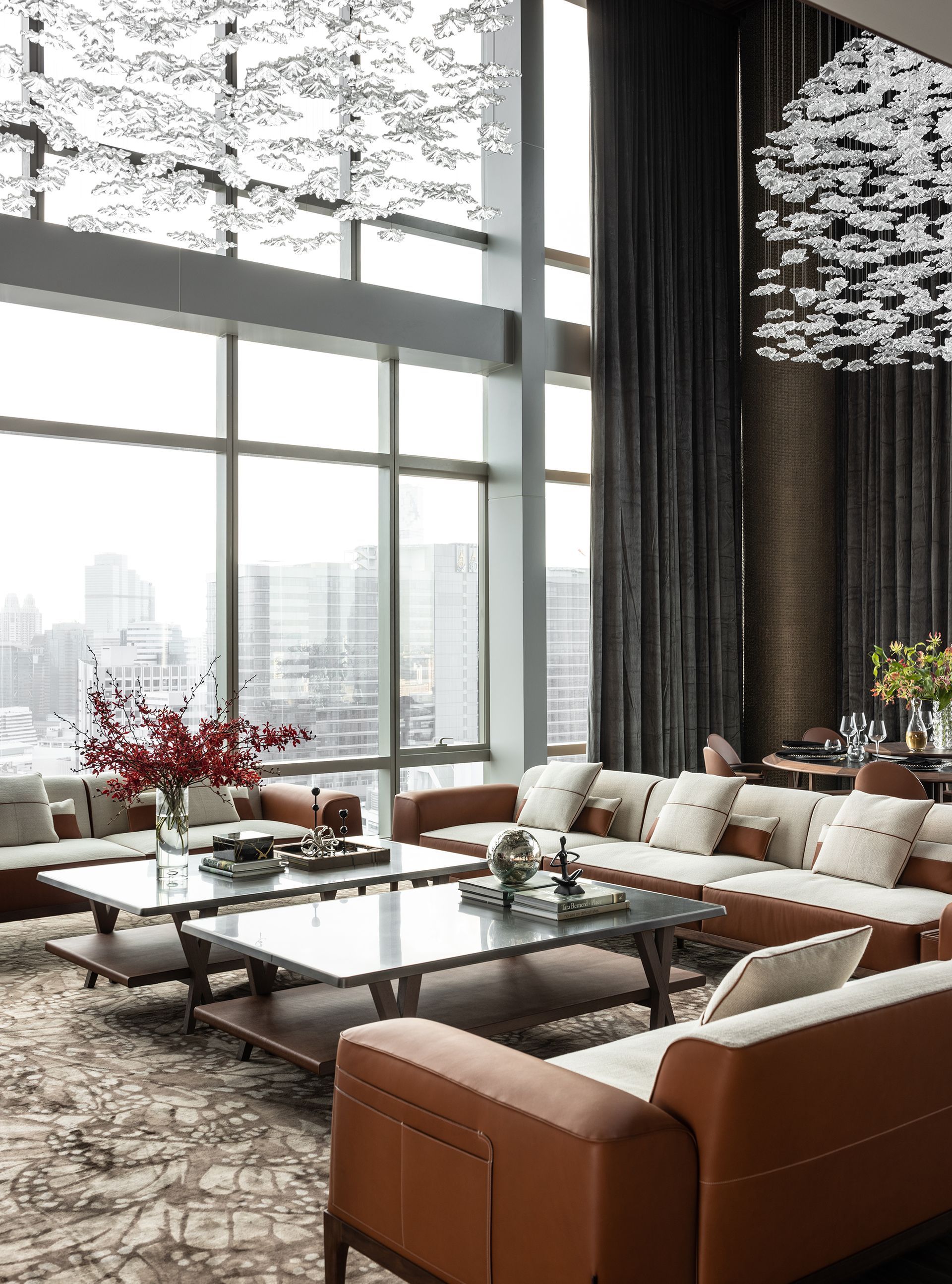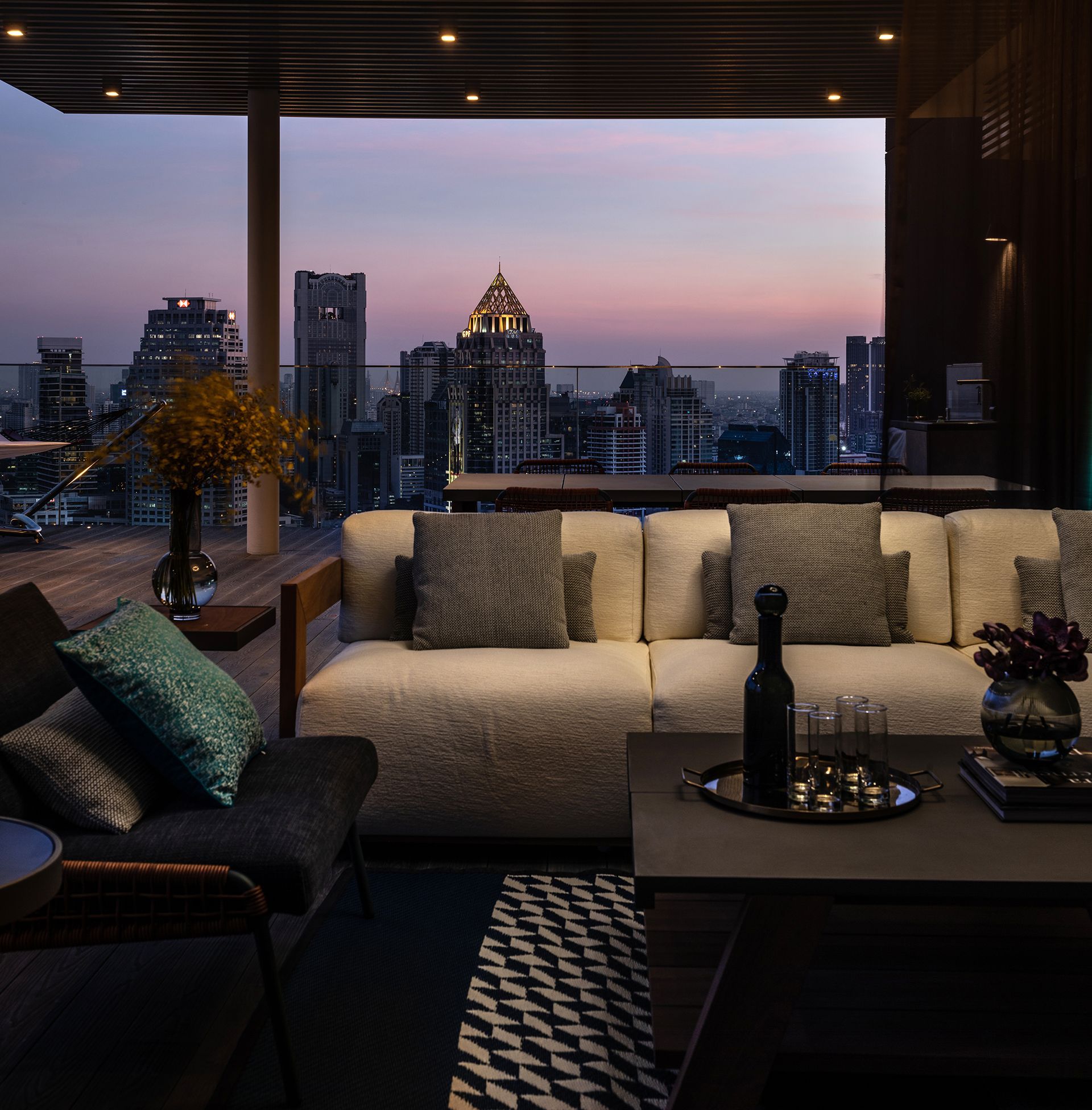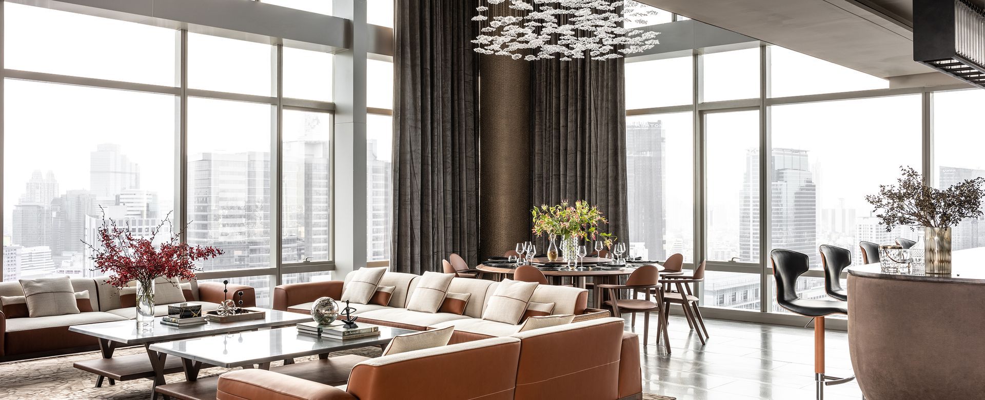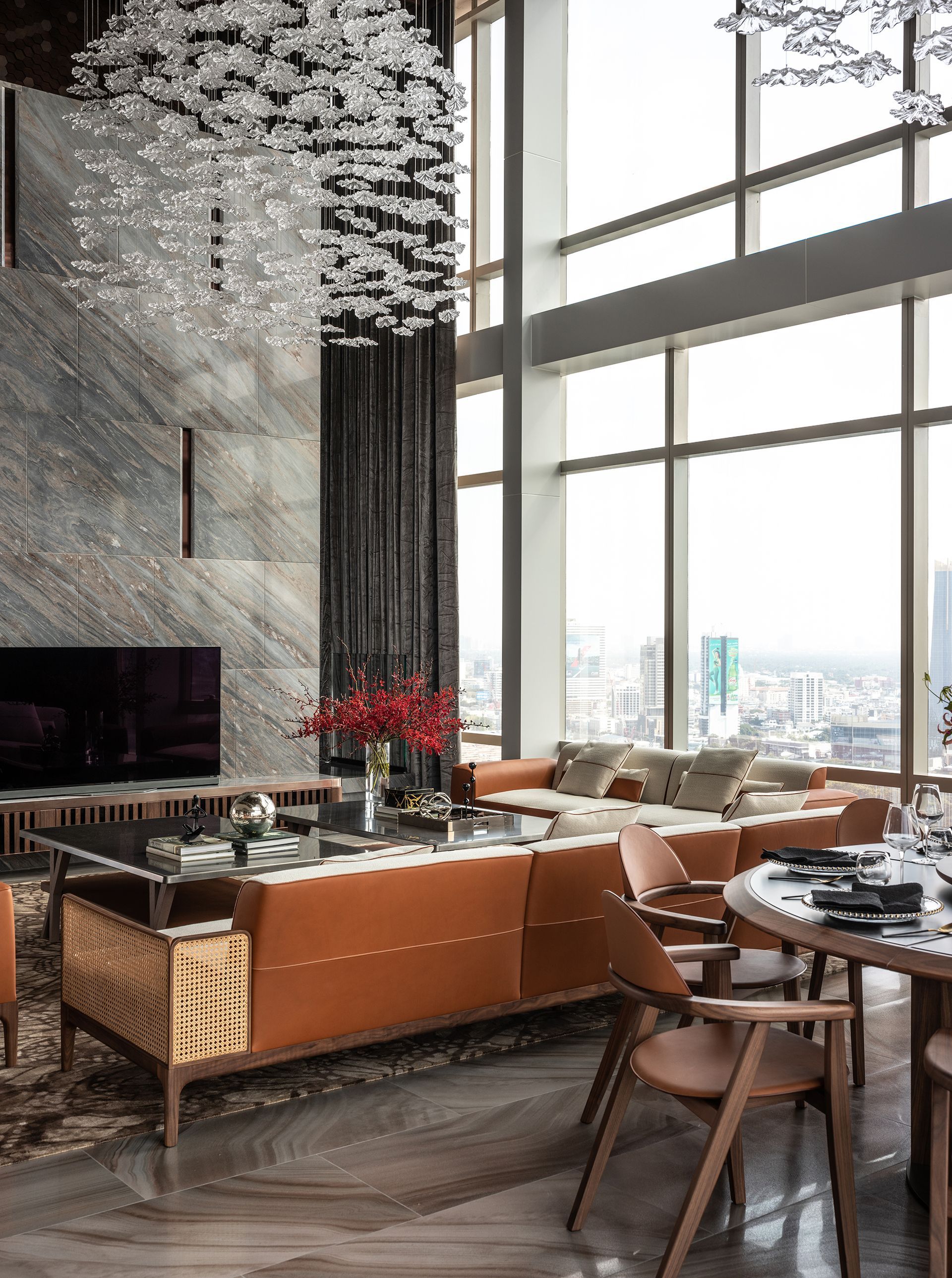 Located in the heart of Bangkok, this sleek two-storey penthouse has sweeping 270-degree views of the city. Overlooking the lush grounds of Lumpini Park, the contemporary four-bedroom home spans 5,000 square feet and features a 1,100-square-foot terrace with an outdoor glasshouse, small spa and 12-metre pool. The home was designed with a rich palette of materials punctuated with subtle bursts of colour. Two dramatic 2.5-metre-long crystal chandeliers, elegant grey ceramic floor tiles by Roberto Cavalli and intricate wood mosaics form the back-drop to warm orange-hued Hermès and Poltrona Frau furnishings made from leather, cane and fabric. At once refined and understated, the home balances bold contemporary detailing with thoughtful, soulful design.