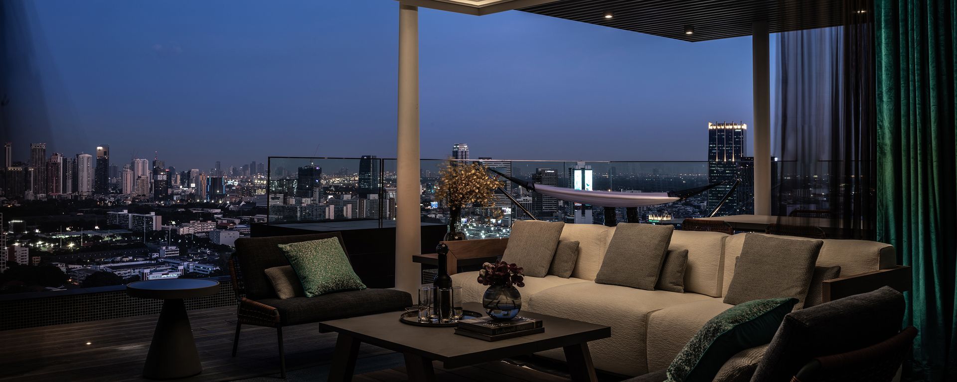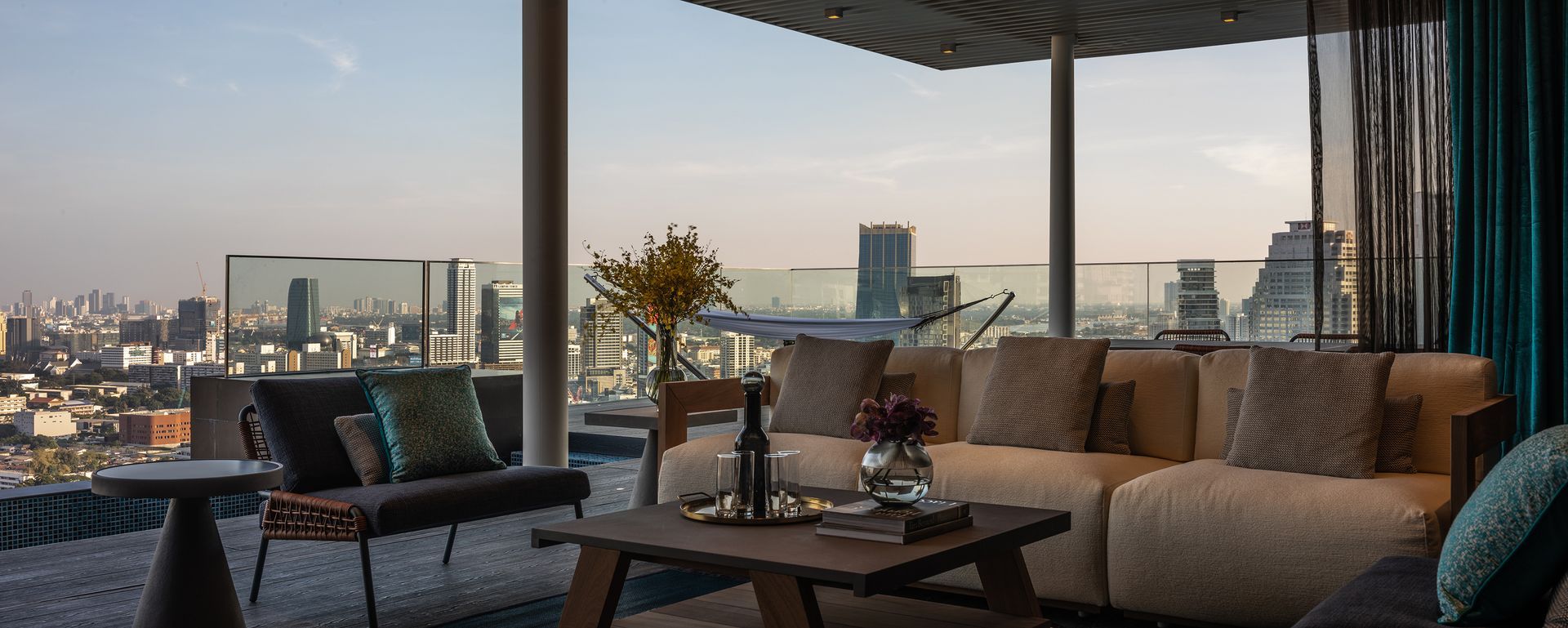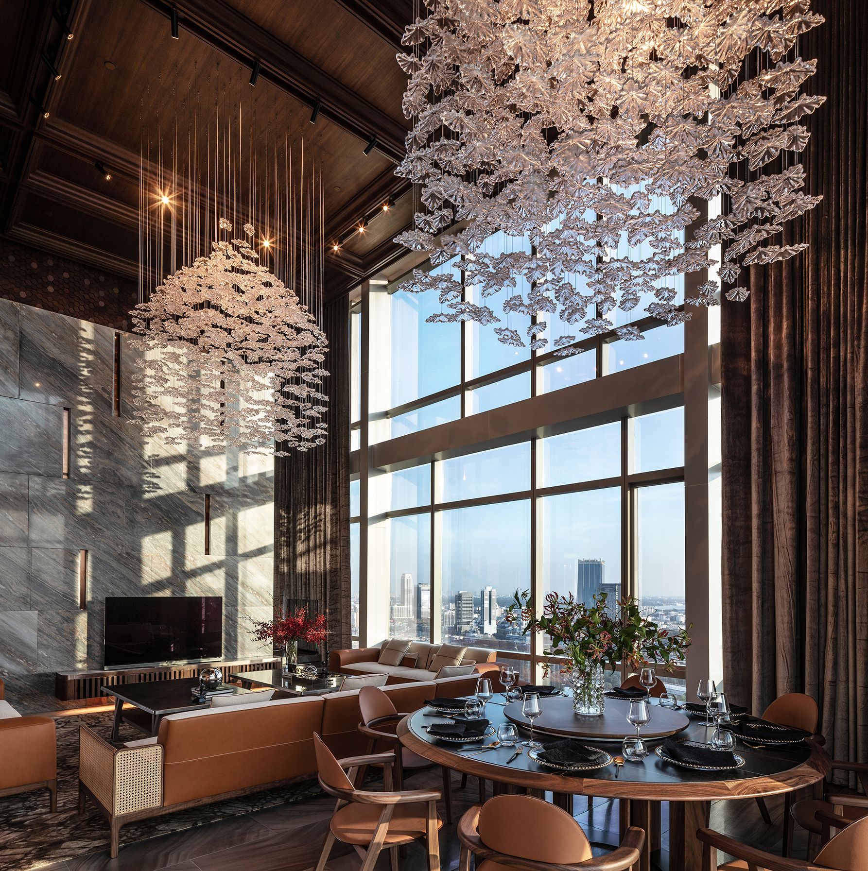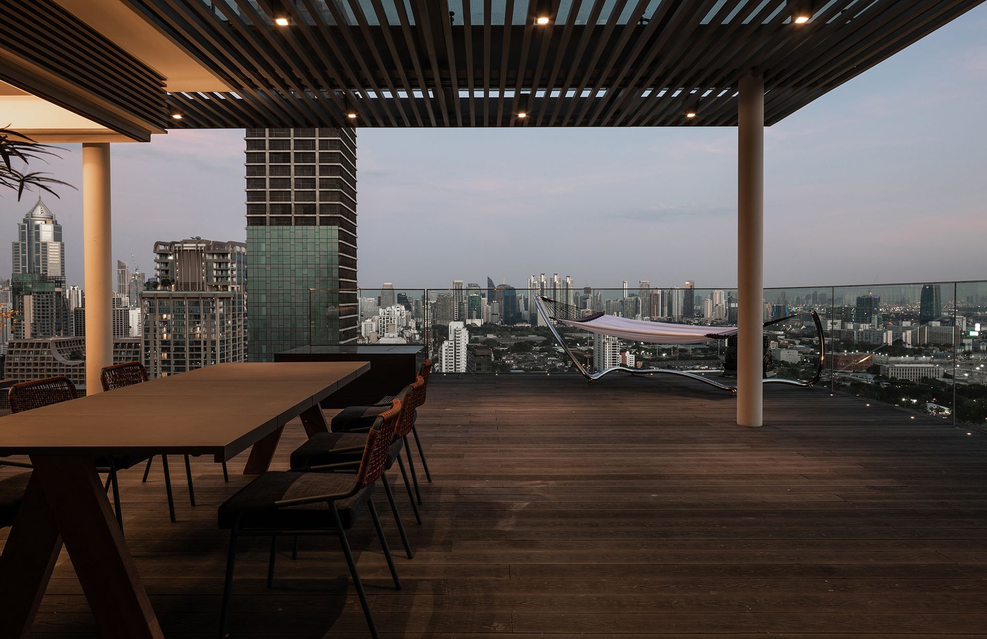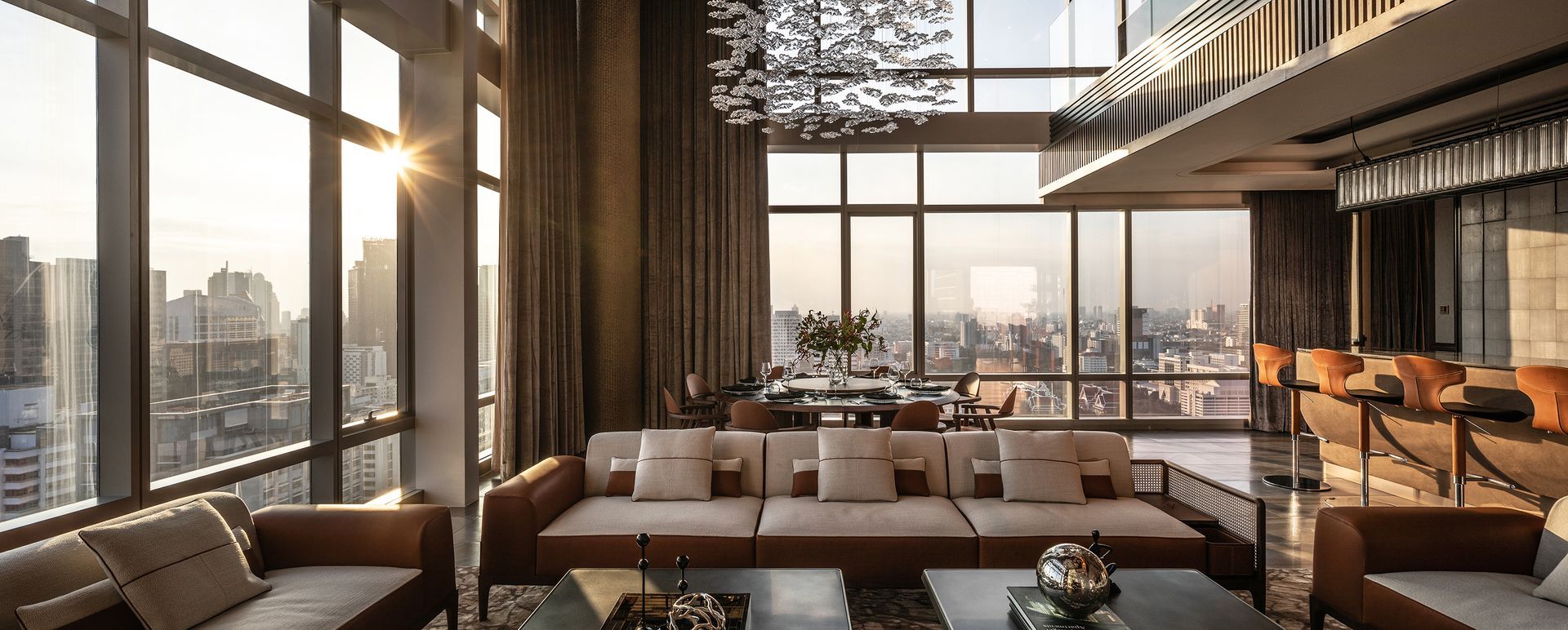Located in the heart of Bangkok, this sleek two-storey penthouse has sweeping 270-degree views of the city. Overlooking the lush grounds of Lumpini Park, the contemporary four-bedroom home spans 5,000 square feet and features a 1,100-square-foot terrace with an outdoor glasshouse, small spa and 12-metre pool. The home was designed with a rich palette of materials punctuated with subtle bursts of colour. Two dramatic 2.5-metre-long crystal chandeliers, elegant grey ceramic floor tiles by Roberto Cavalli and intricate wood mosaics form the back-drop to warm orange-hued Hermès and Poltrona Frau furnishings made from leather, cane and fabric. At once refined and understated, the home balances bold contemporary detailing with thoughtful, soulful design.