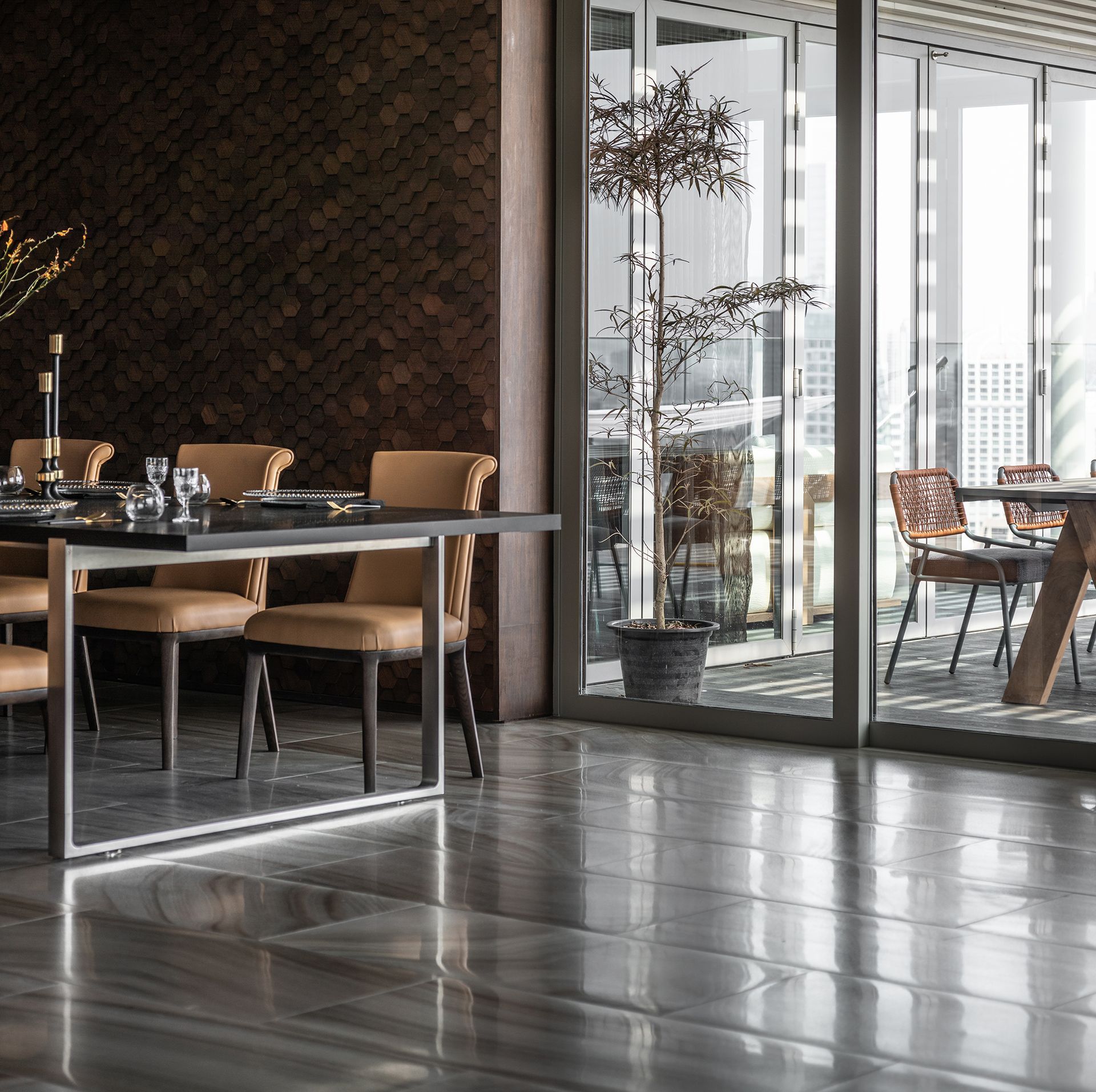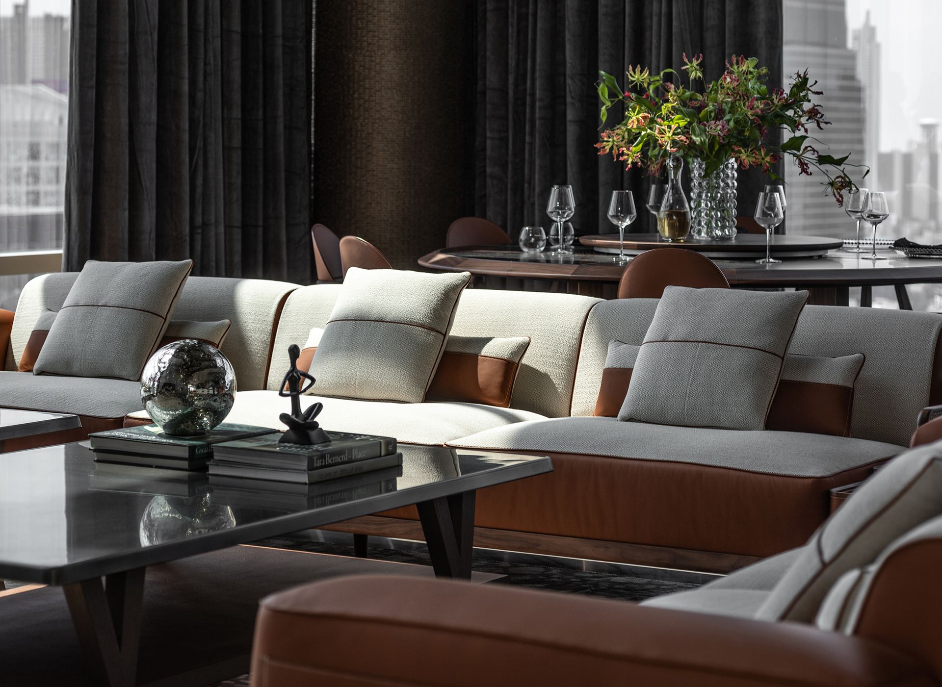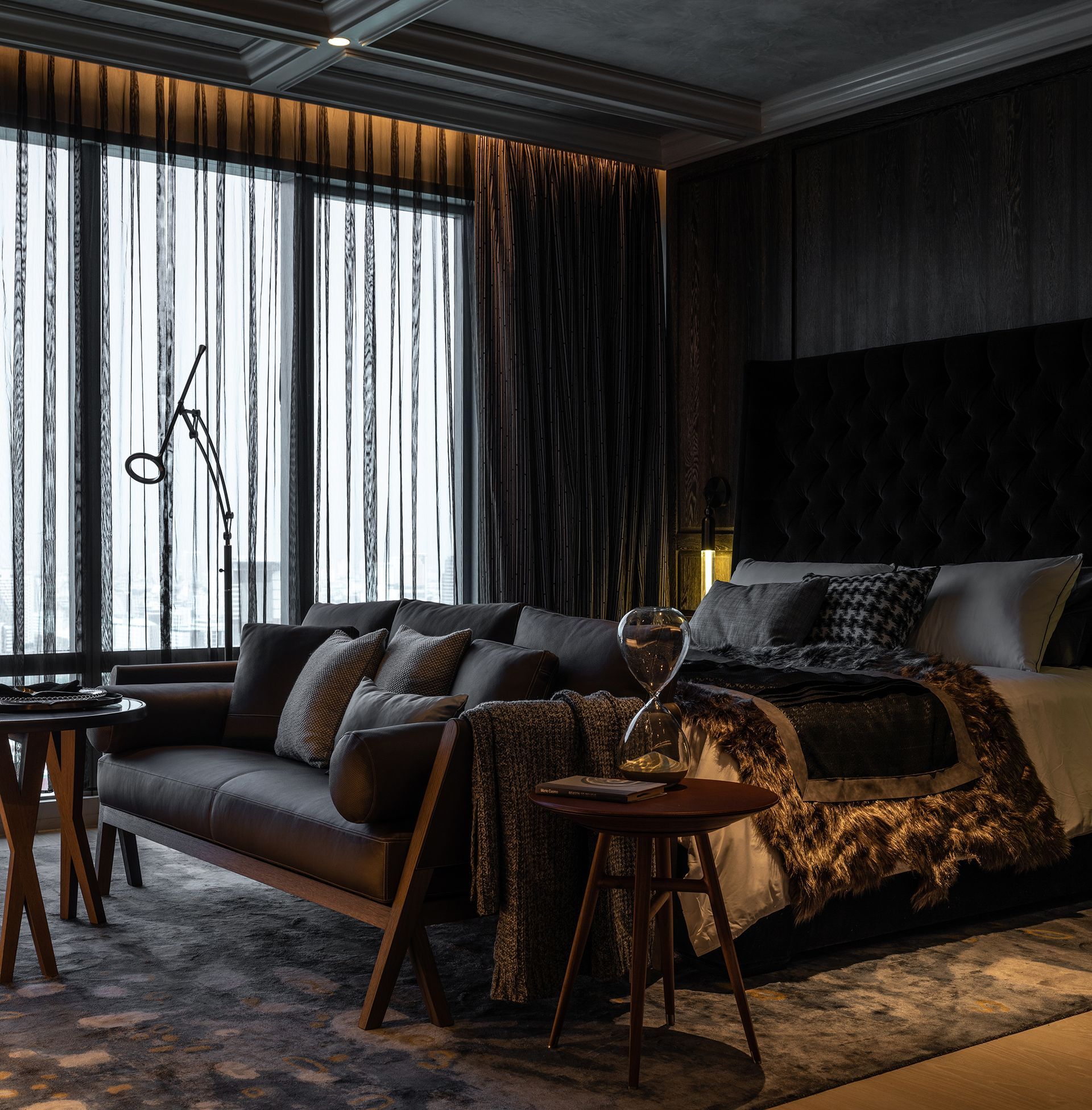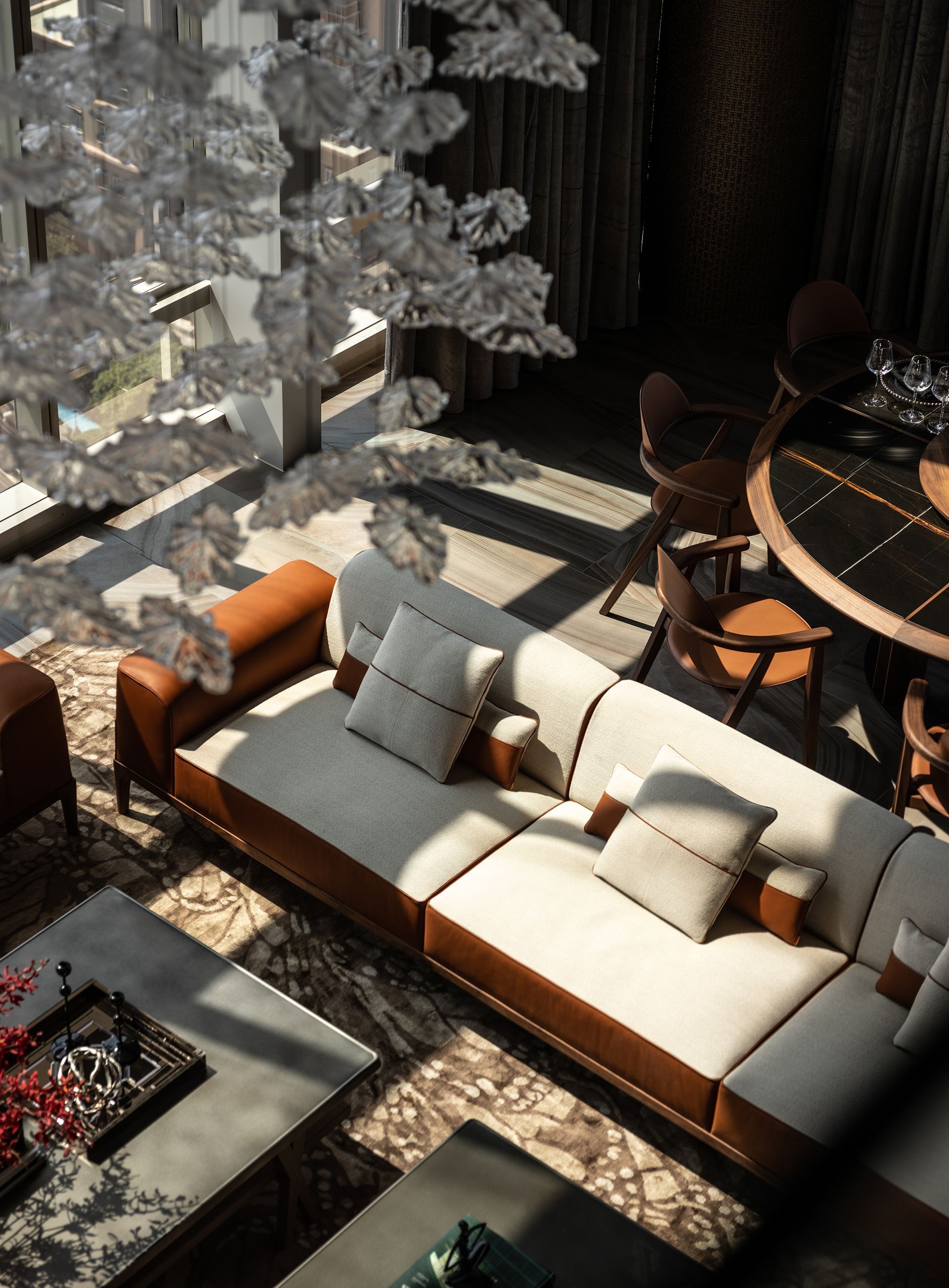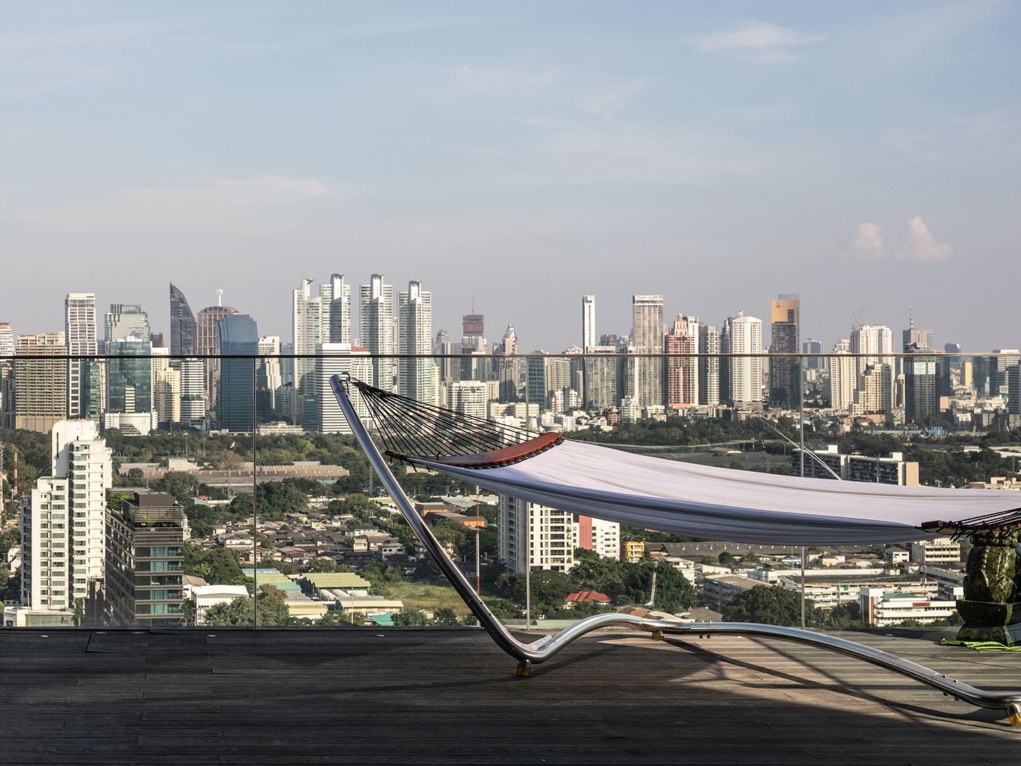 Located in the heart of Bangkok, this sleek two-storey penthouse has sweeping 270-degree views of the city. Overlooking the lush grounds of Lumpini Park, the contemporary four-bedroom home spans 5,000 square feet and features a 1,100-square-foot terrace with an outdoor glasshouse, small spa and 12-metre pool. The home was designed with a rich palette of materials punctuated with subtle bursts of colour. Two dramatic 2.5-metre-long crystal chandeliers, elegant grey ceramic floor tiles by Roberto Cavalli and intricate wood mosaics form the back-drop to warm orange-hued Hermès and Poltrona Frau furnishings made from leather, cane and fabric. At once refined and understated, the home balances bold contemporary detailing with thoughtful, soulful design.