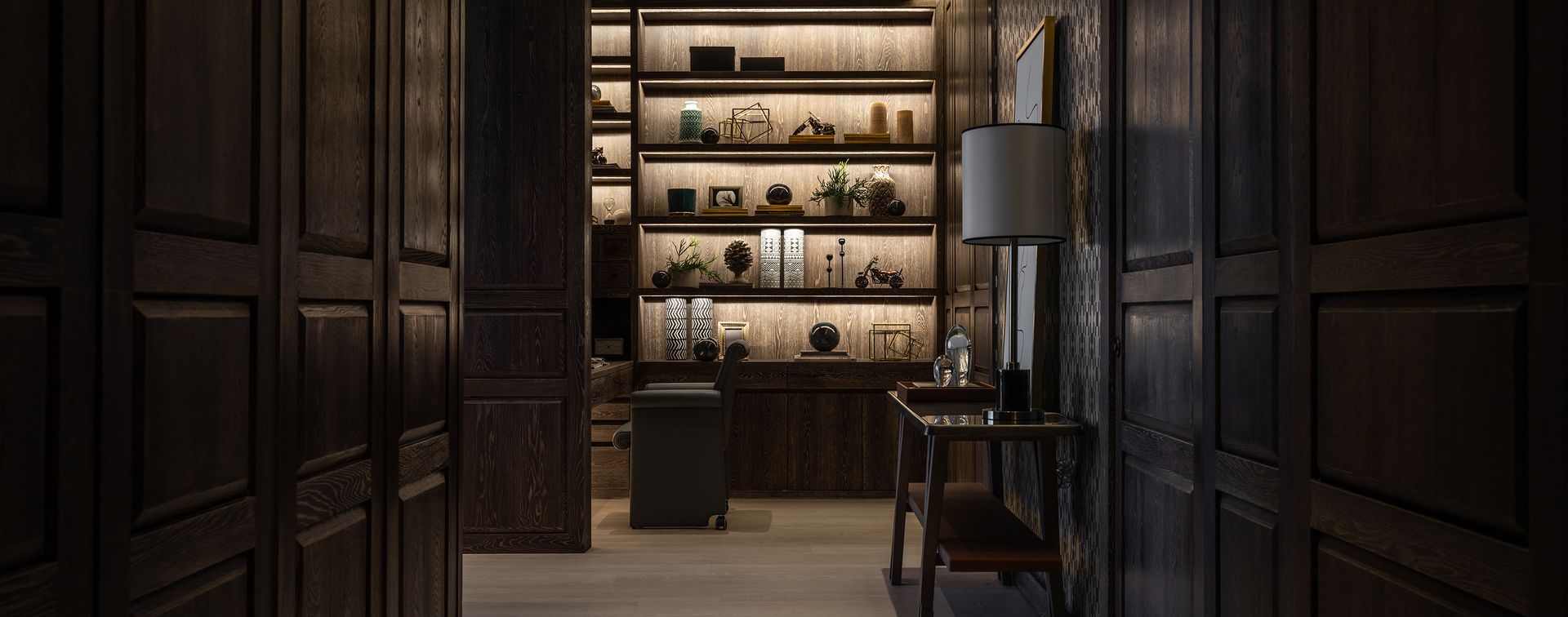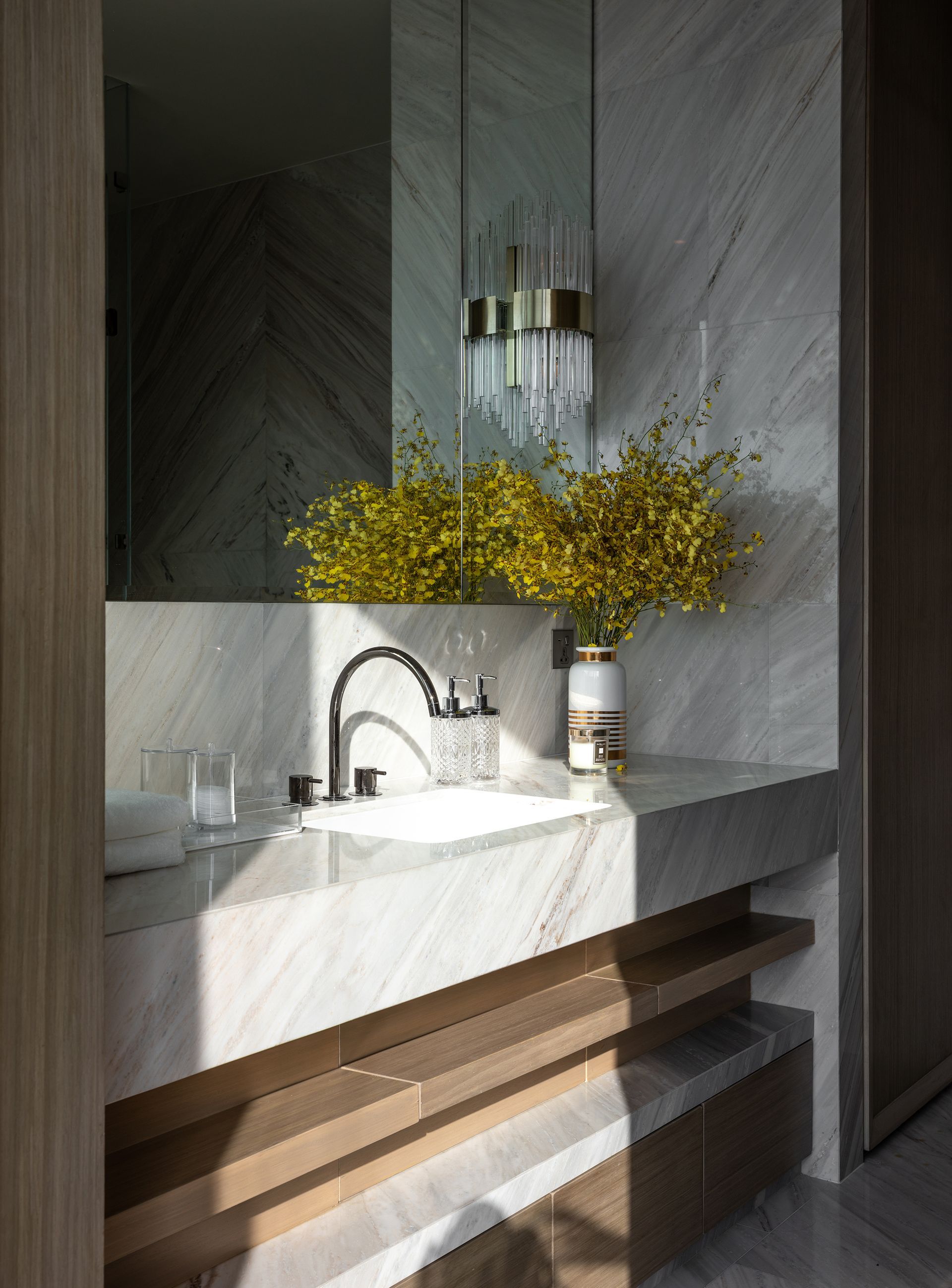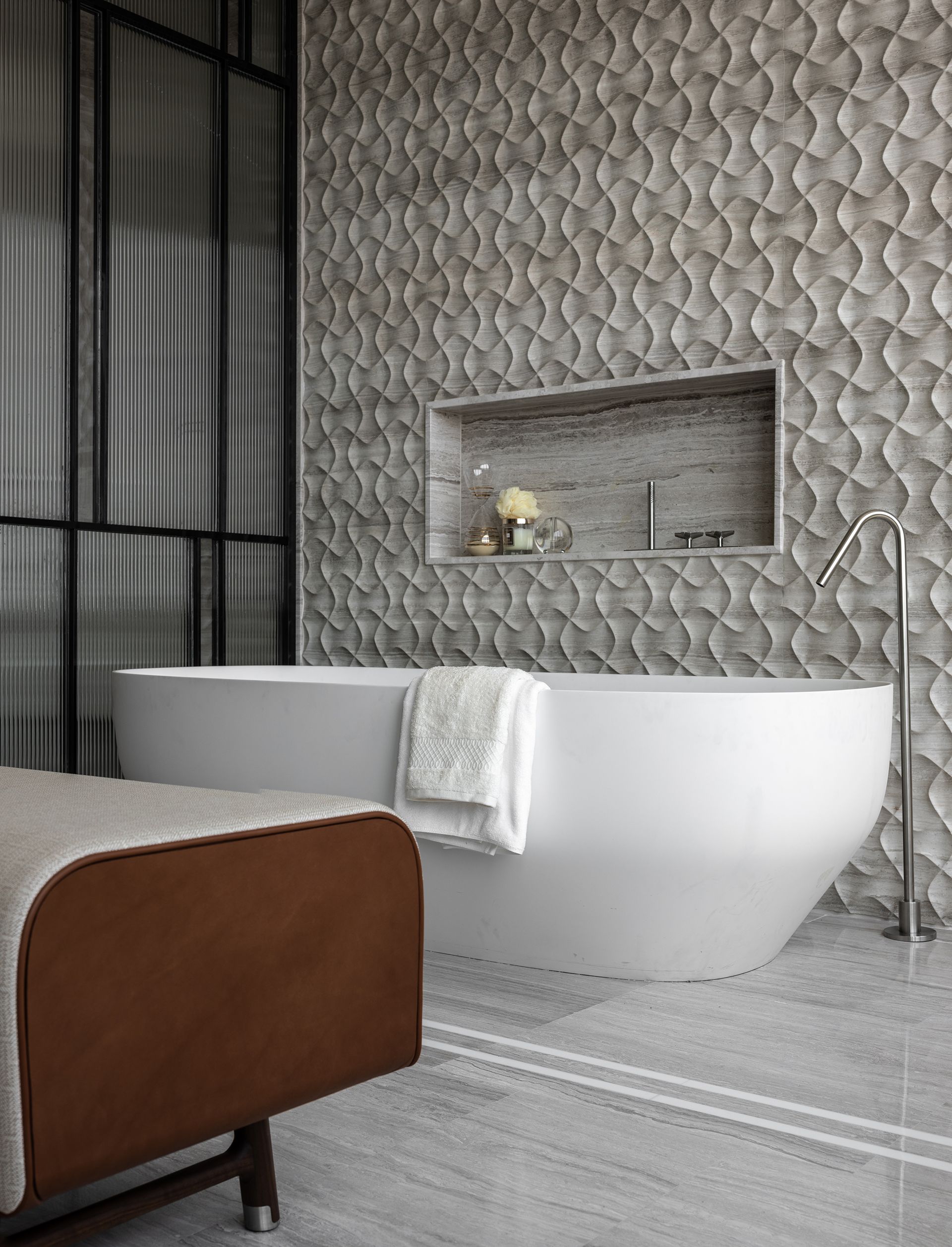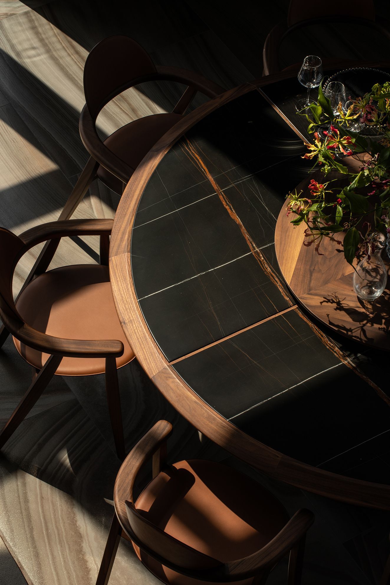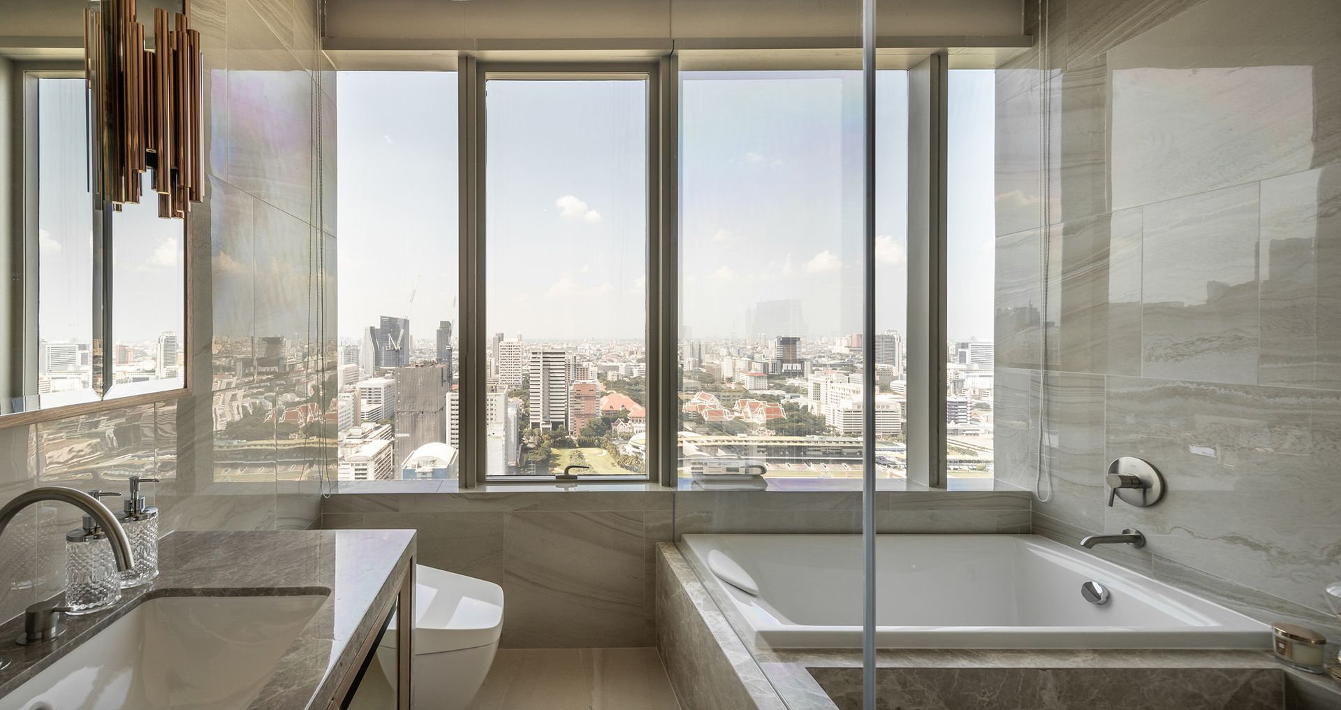 Located in the heart of Bangkok, this sleek two-storey penthouse has sweeping 270-degree views of the city. Overlooking the lush grounds of Lumpini Park, the contemporary four-bedroom home spans 5,000 square feet and features a 1,100-square-foot terrace with an outdoor glasshouse, small spa and 12-metre pool. The home was designed with a rich palette of materials punctuated with subtle bursts of colour. Two dramatic 2.5-metre-long crystal chandeliers, elegant grey ceramic floor tiles by Roberto Cavalli and intricate wood mosaics form the back-drop to warm orange-hued Hermès and Poltrona Frau furnishings made from leather, cane and fabric. At once refined and understated, the home balances bold contemporary detailing with thoughtful, soulful design.