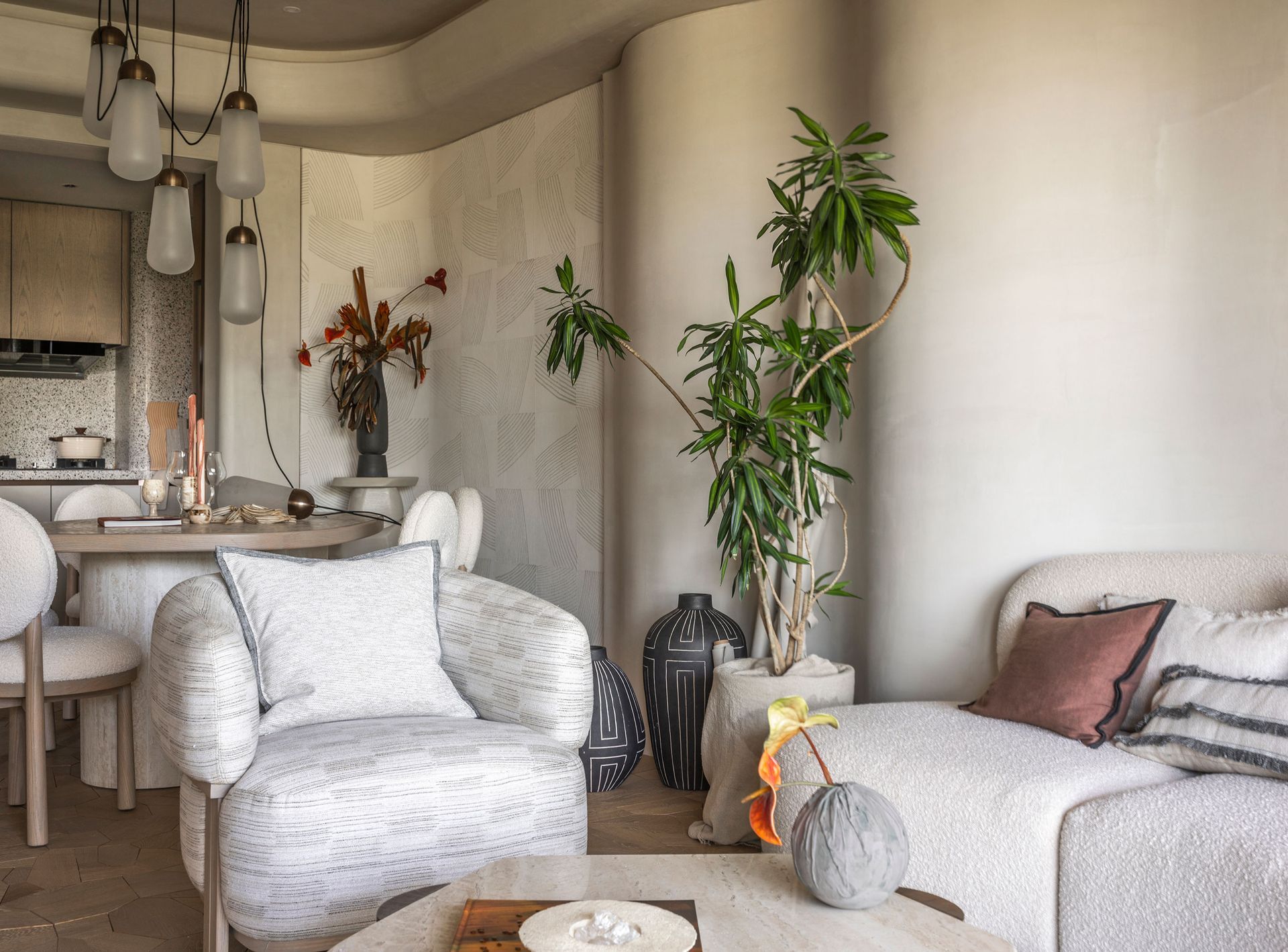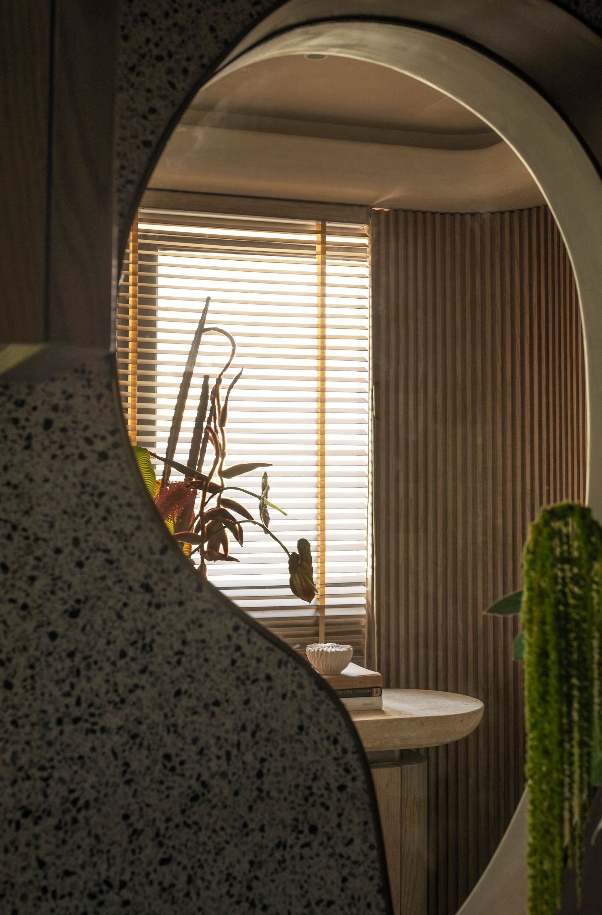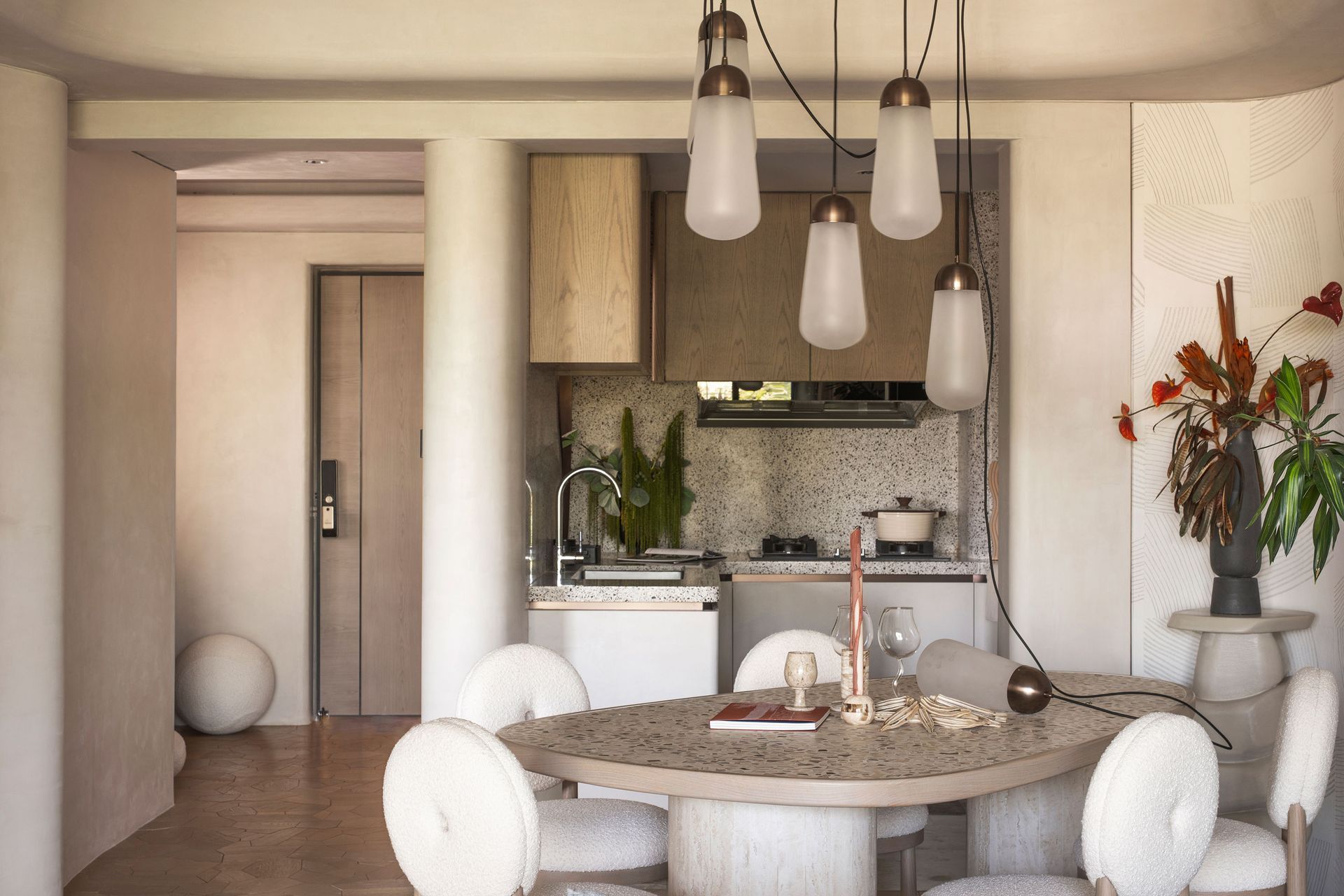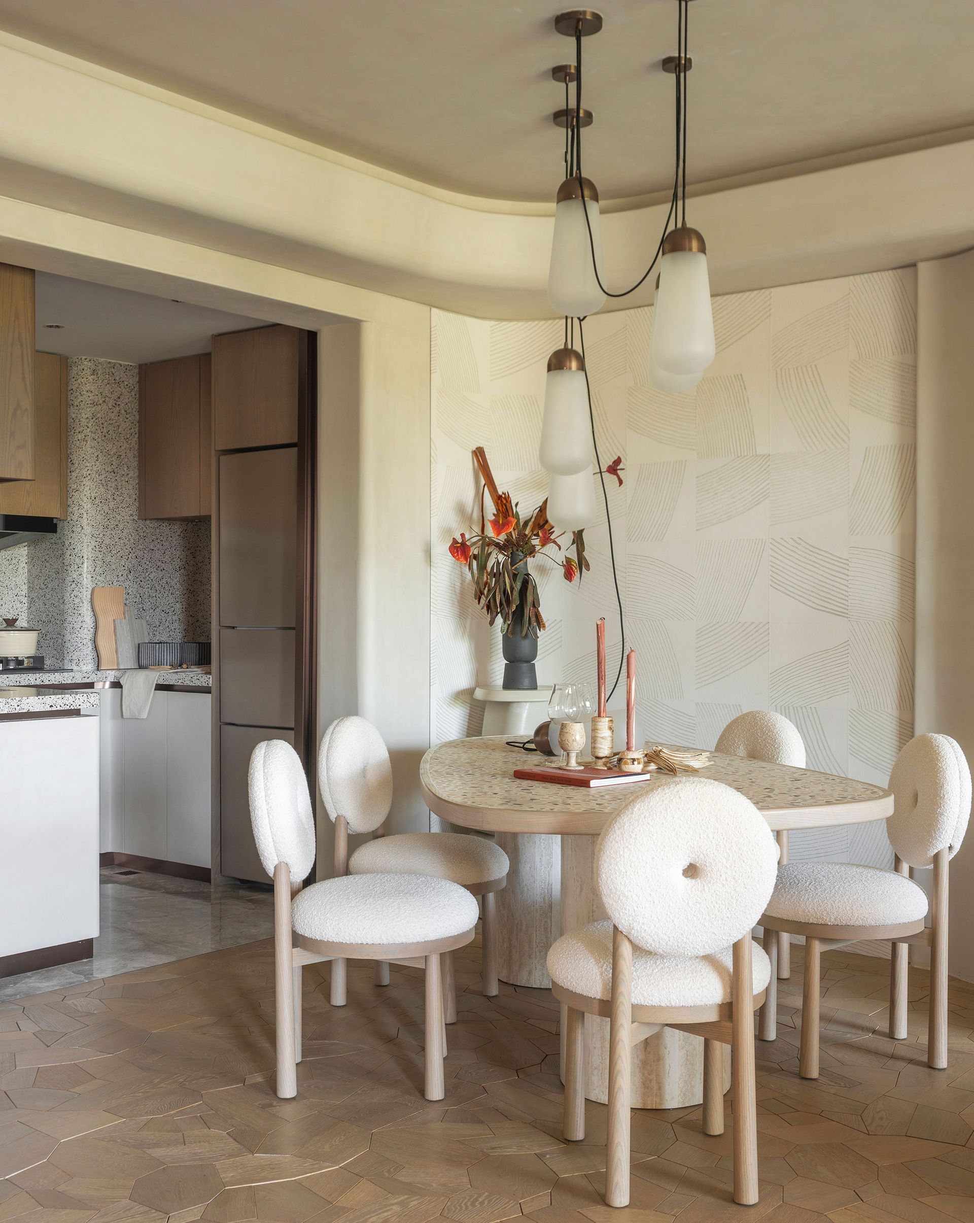 This minimalist show flat in Hainan takes its cues from a wild coastal landscape. It draws inspiration from sweeping waves and undulating forms which lie in the depths of the ocean floor. The design is based on a creative artist couple who have built their dream home. They have two young children Jack and Hannah. Their family home is a reflection of their values and poetic outlook on life. They have cultivated a serene abode that goes beyond the mundane and merges art with life.
