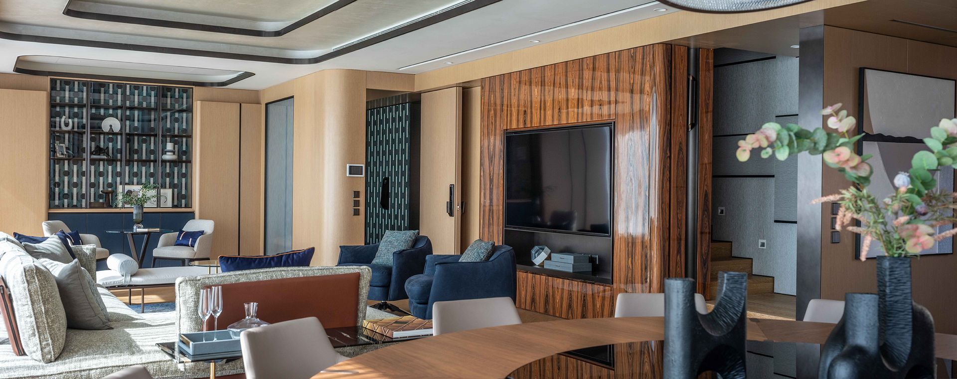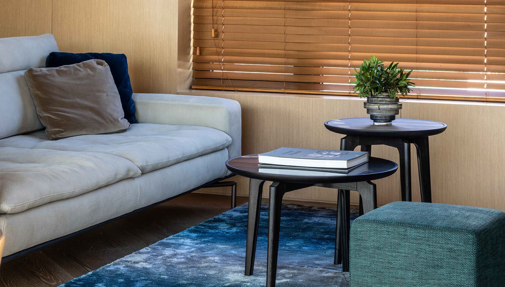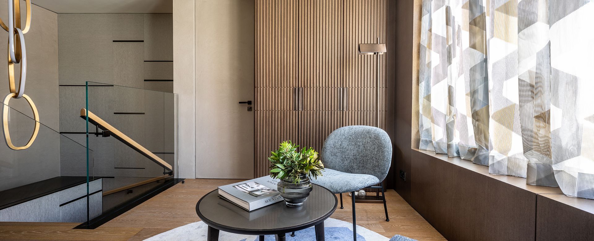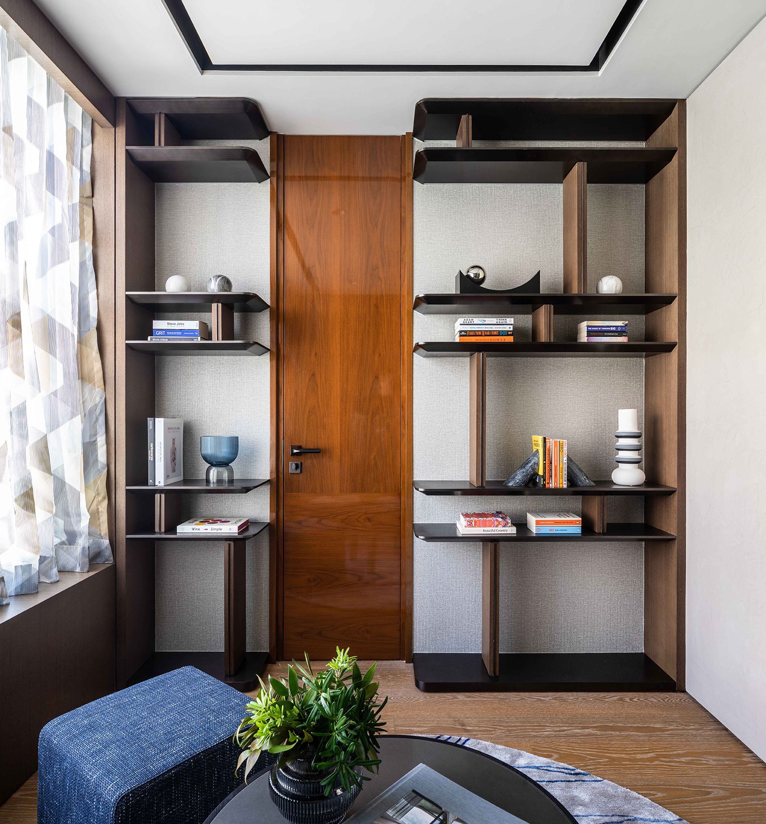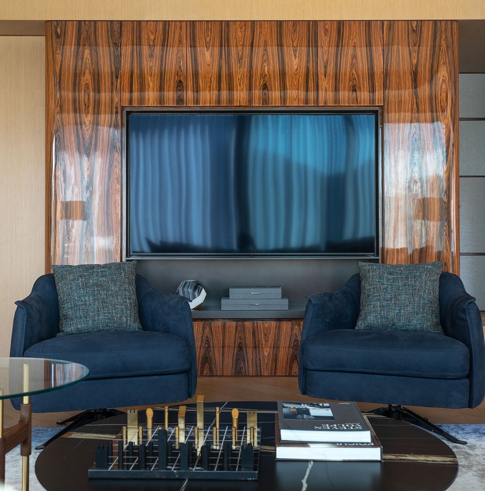 A private enclave in the verdant residential area of Jardin’s Lookout, this duplex offers a relaxed escape for a small family. The home has two distinct personalities serving as a warm, stylish family abode in the day and a sleek, sophisticated space for entertaining at night. Bathed in natural light, the open-plan living room opens up to a mountainous landscape through expansive ribbon windows. The home’s luxurious material palette consists of wood, leather, marble and glass. Striking sculptural light fixtures and bold accent walls add a sense of drama while saturated shades of navy blue add a pop of colour to the neutral furnishings. Deeply informed by Feng Shui principles, the home is a veritable oasis of calm and elegance.