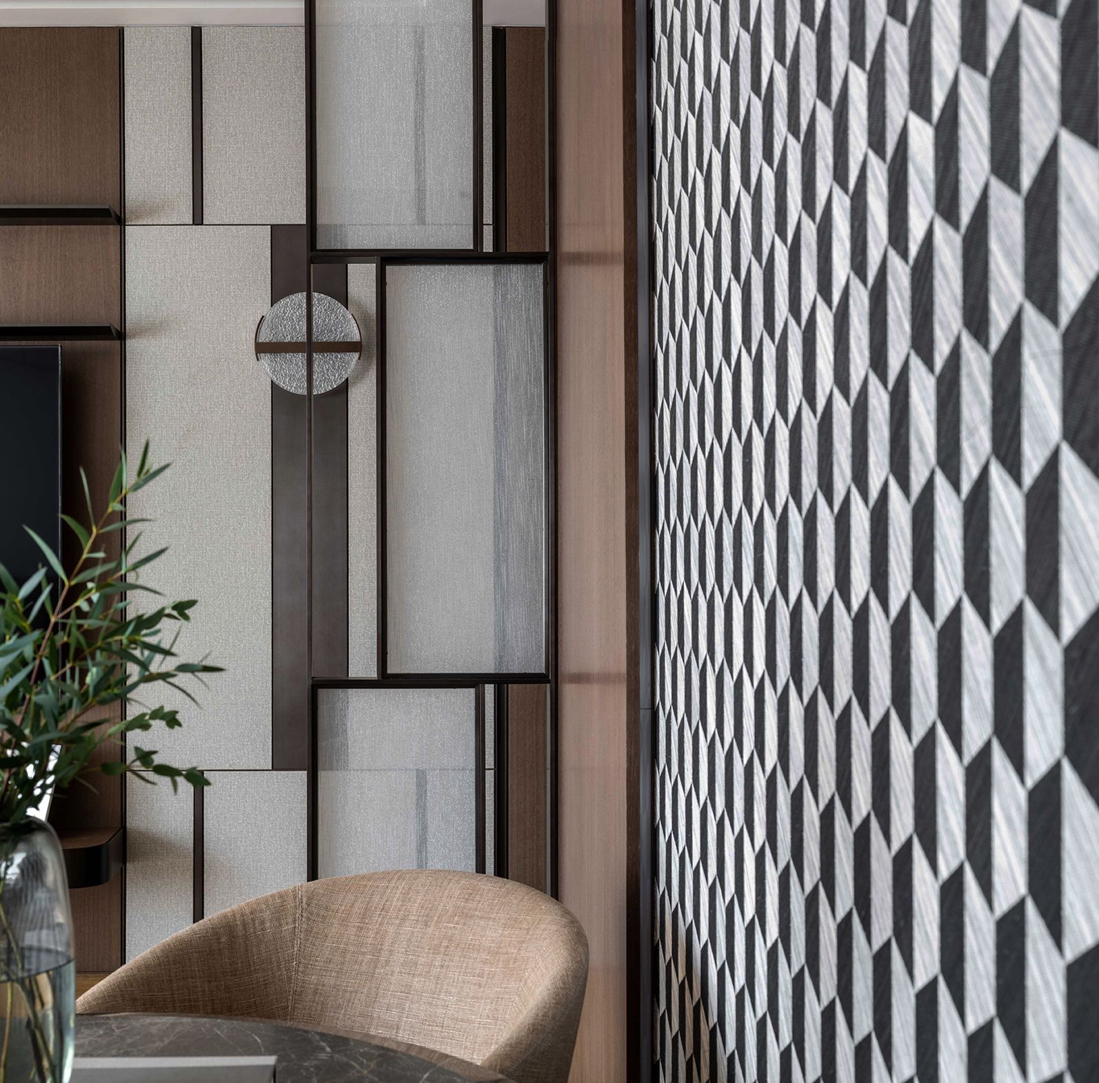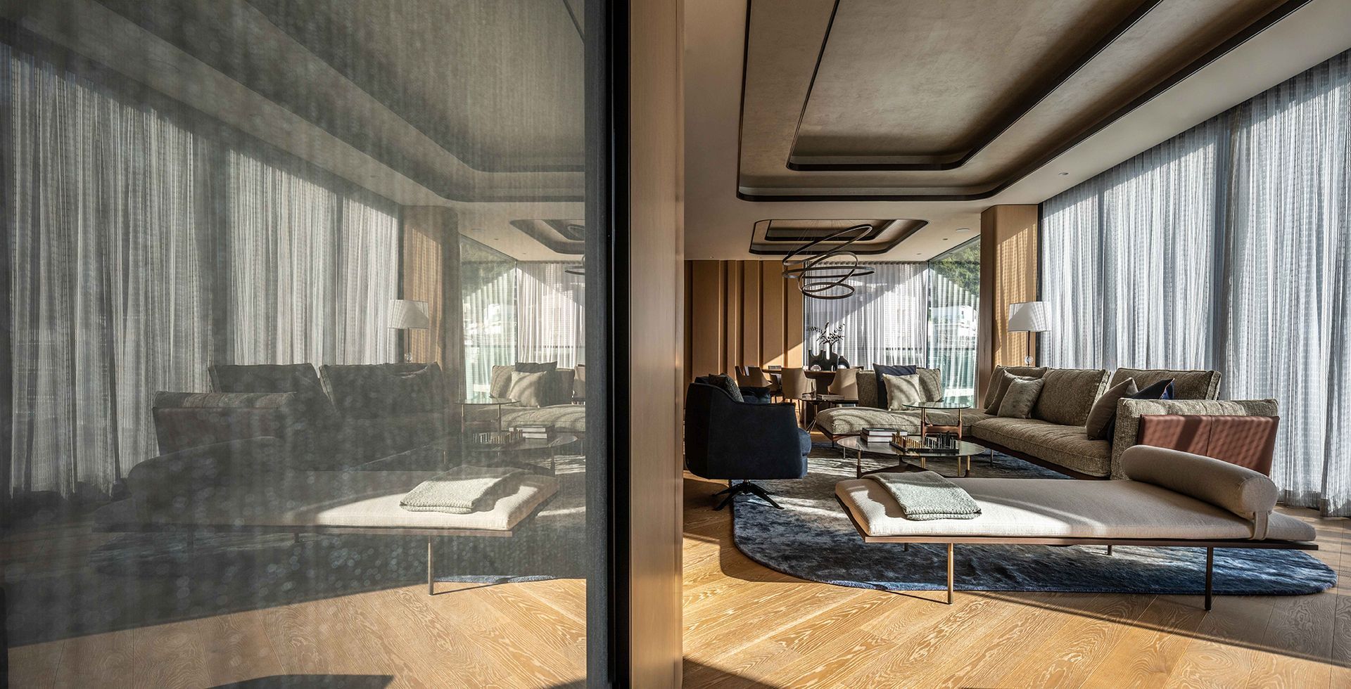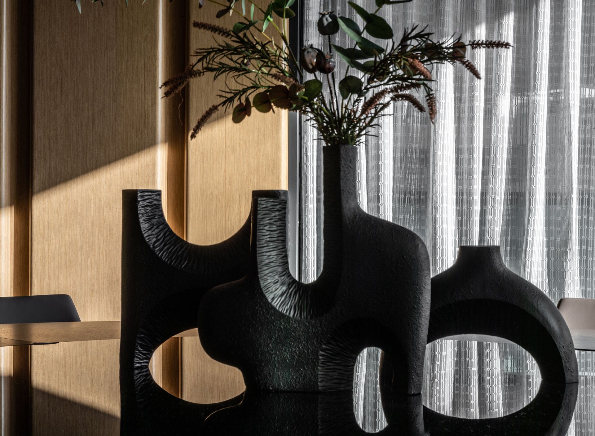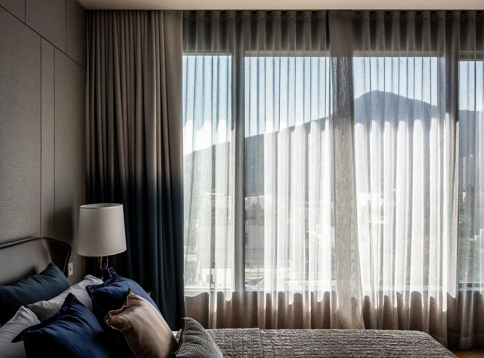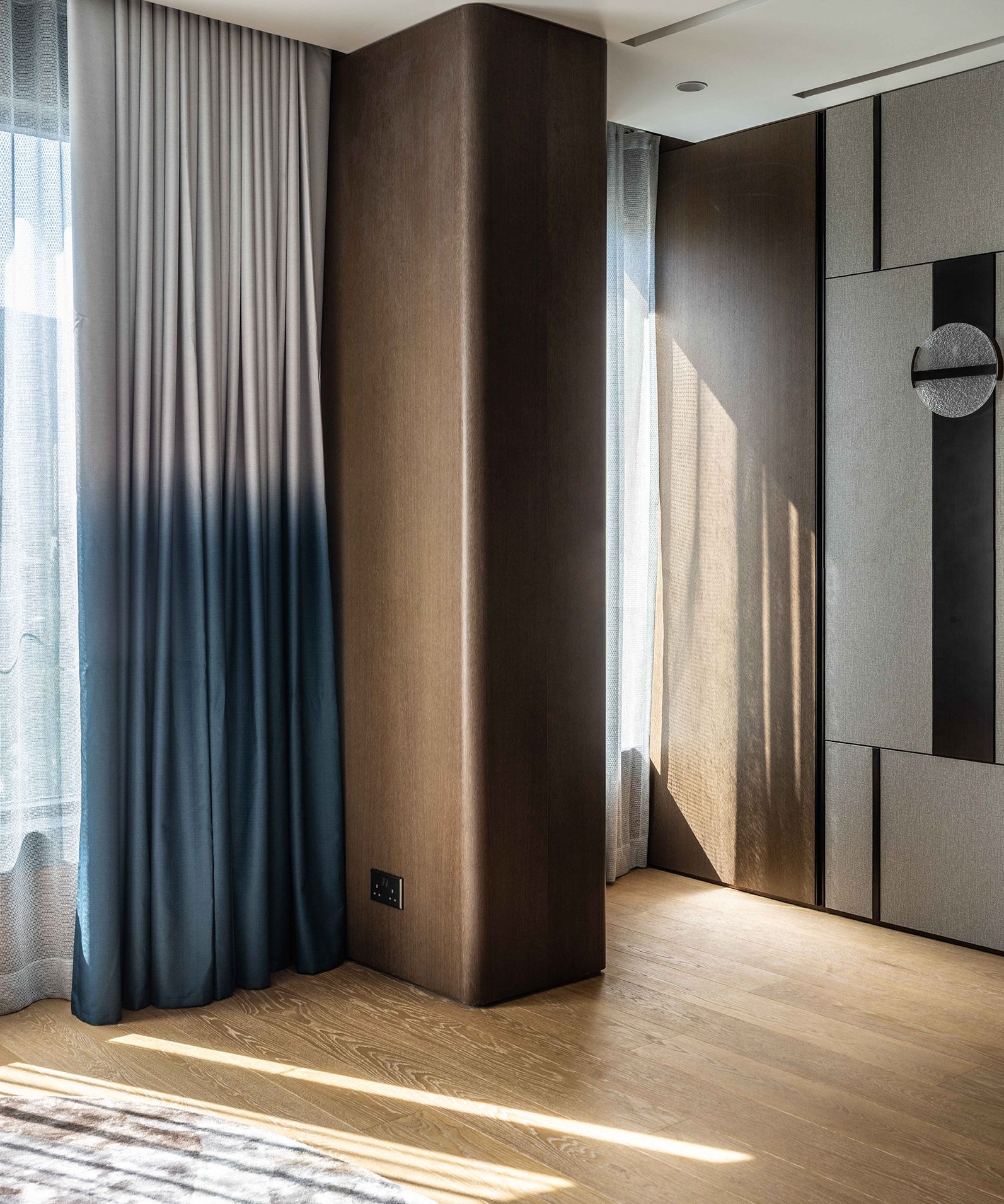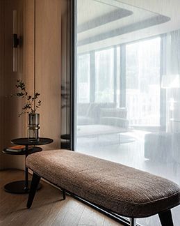 A private enclave in the verdant residential area of Jardin’s Lookout, this duplex offers a relaxed escape for a small family. The home has two distinct personalities serving as a warm, stylish family abode in the day and a sleek, sophisticated space for entertaining at night. Bathed in natural light, the open-plan living room opens up to a mountainous landscape through expansive ribbon windows. The home’s luxurious material palette consists of wood, leather, marble and glass. Striking sculptural light fixtures and bold accent walls add a sense of drama while saturated shades of navy blue add a pop of colour to the neutral furnishings. Deeply informed by Feng Shui principles, the home is a veritable oasis of calm and elegance.