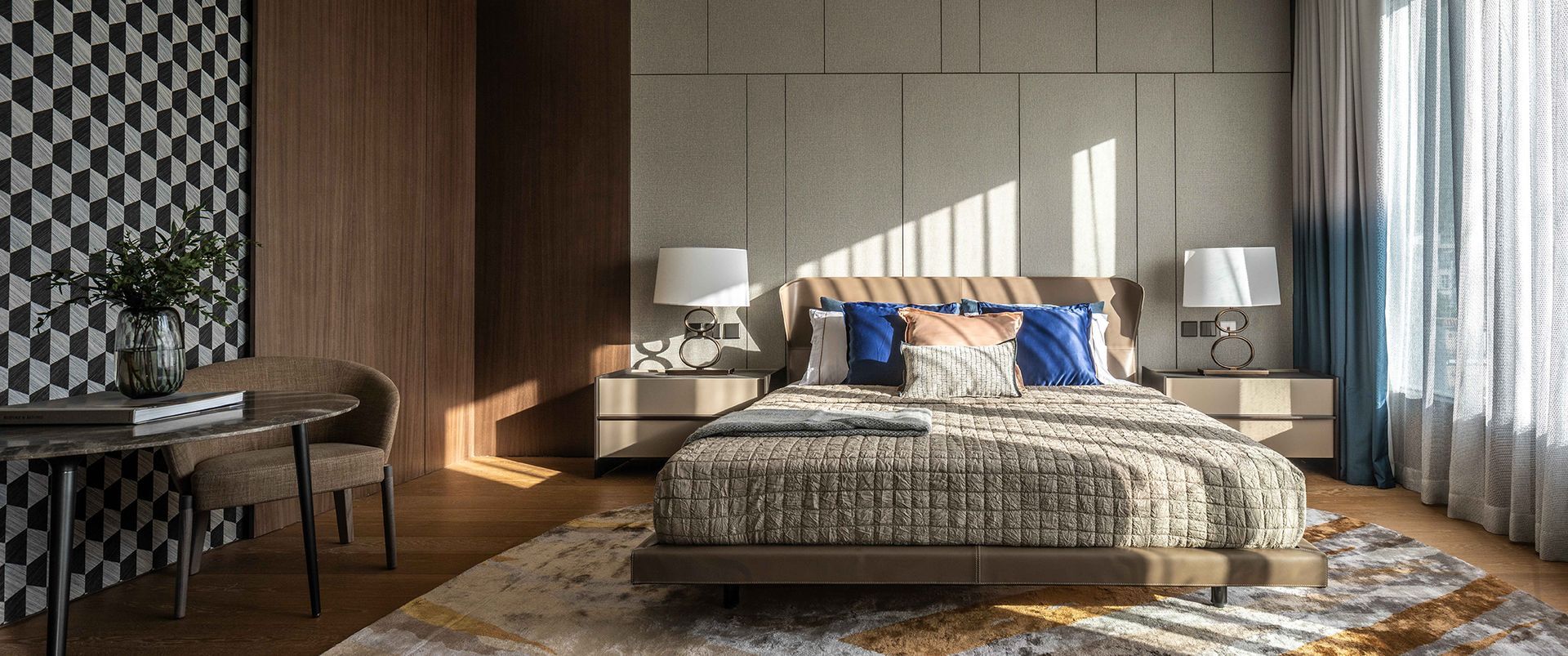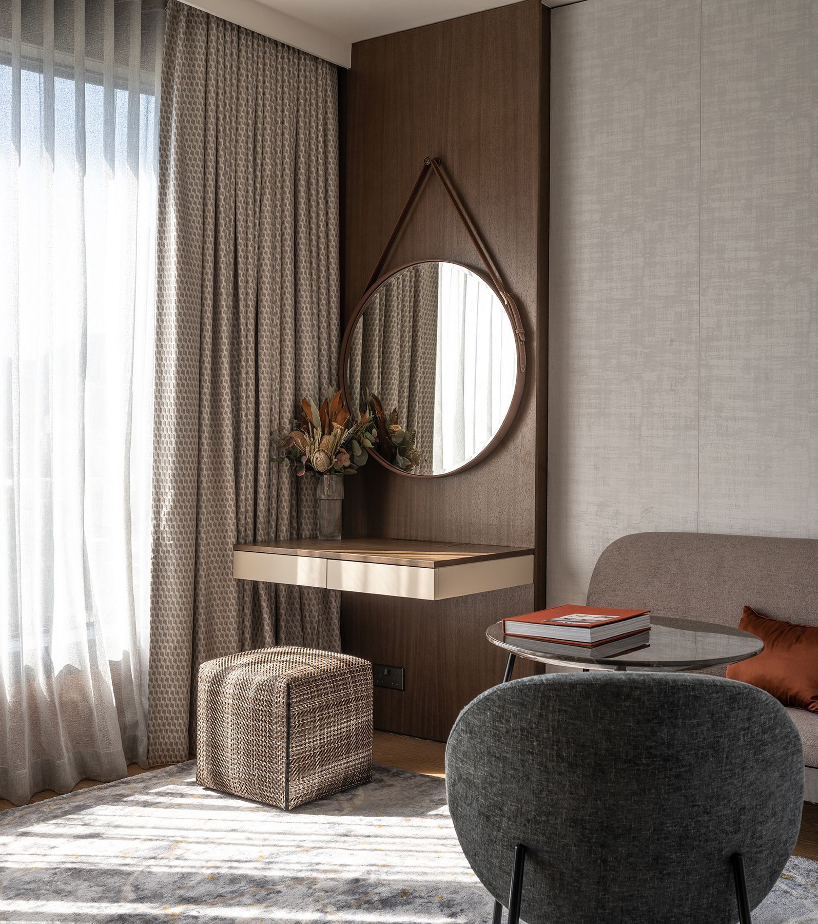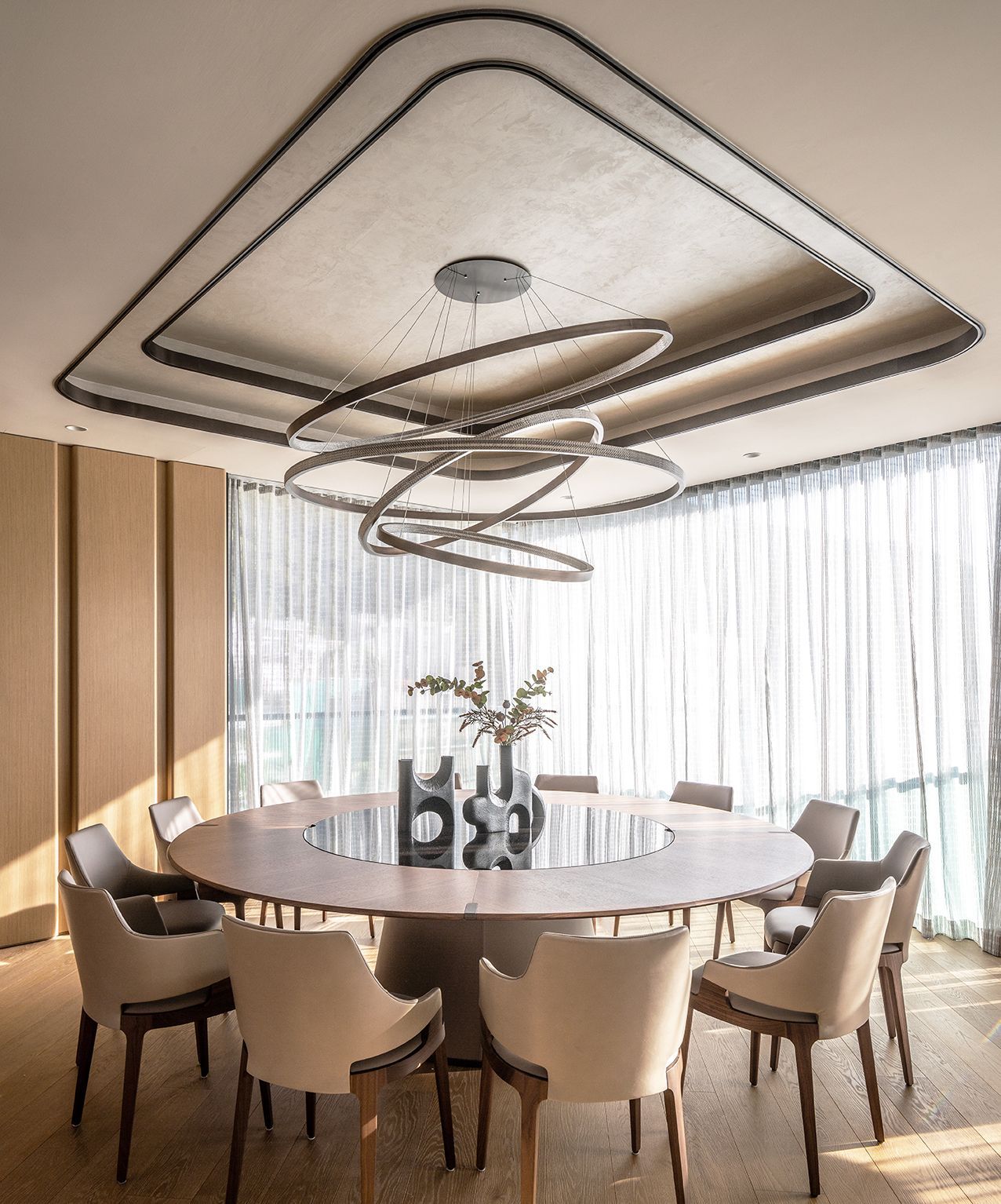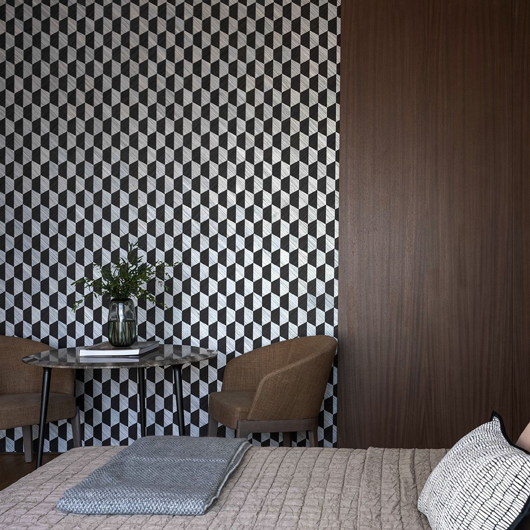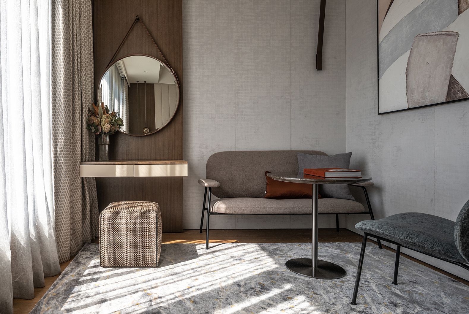 A private enclave in the verdant residential area of Jardin’s Lookout, this duplex offers a relaxed escape for a small family. The home has two distinct personalities serving as a warm, stylish family abode in the day and a sleek, sophisticated space for entertaining at night. Bathed in natural light, the open-plan living room opens up to a mountainous landscape through expansive ribbon windows. The home’s luxurious material palette consists of wood, leather, marble and glass. Striking sculptural light fixtures and bold accent walls add a sense of drama while saturated shades of navy blue add a pop of colour to the neutral furnishings. Deeply informed by Feng Shui principles, the home is a veritable oasis of calm and elegance.